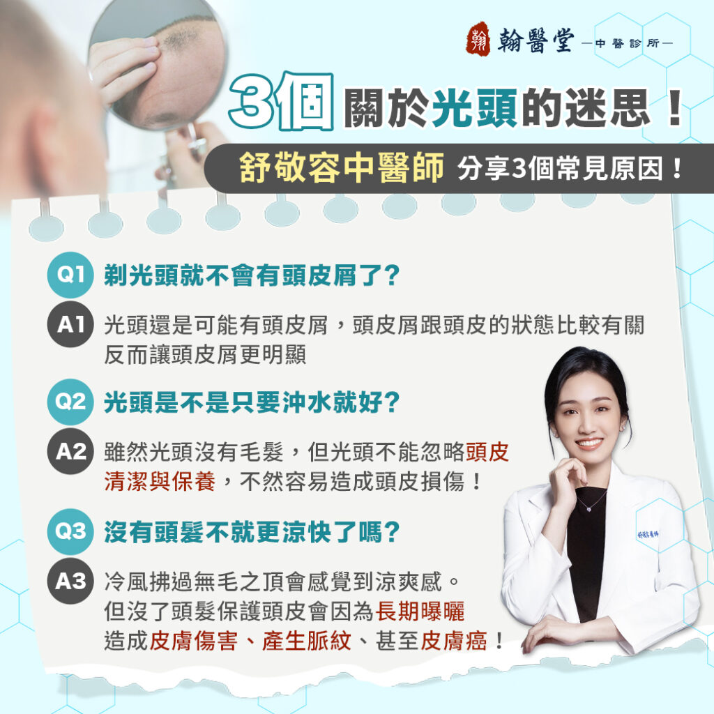 舒敬容中醫師指出,其實不論有沒有頭髮,只要頭皮油脂分泌不平衡或角質堆積,仍可能出現頭皮屑。剃成光頭反而會讓原本被頭髮遮住的頭皮屑更明顯。想改善頭皮屑,關鍵在調整頭皮環境,而非剃光頭。
