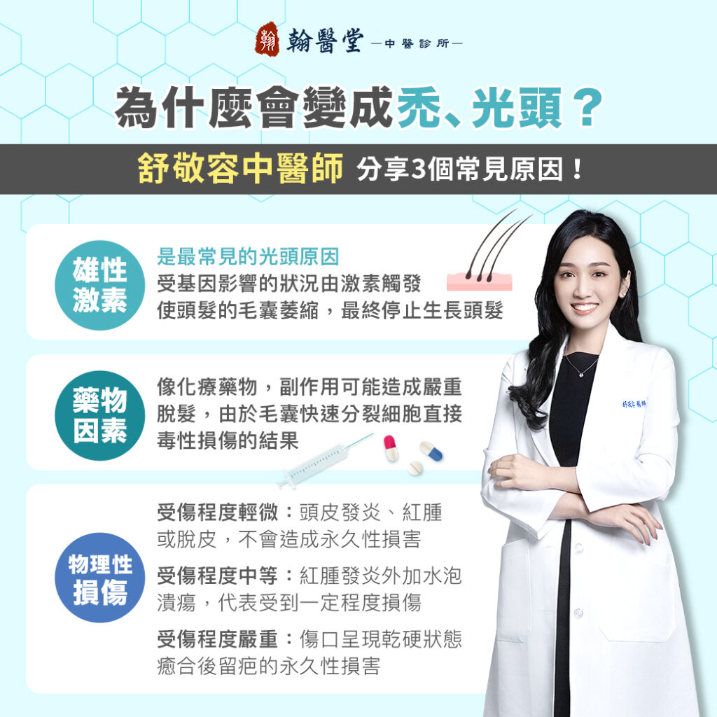 禿頭雖常見,但只要及早發現、針對體質調理,就有機會改善。中醫會依個人體質,從「補腎養血、疏肝解鬱、健脾化濕」等方向調整,同時搭配飲食、穴道按摩與生活作息改善,幫助毛囊恢復活性、促進生髮。若出現髮量減少、髮際線後移或頭皮出油明顯等狀況,建議儘早諮詢專業中醫師,找出根本原因,才能真正延緩禿頭進程。