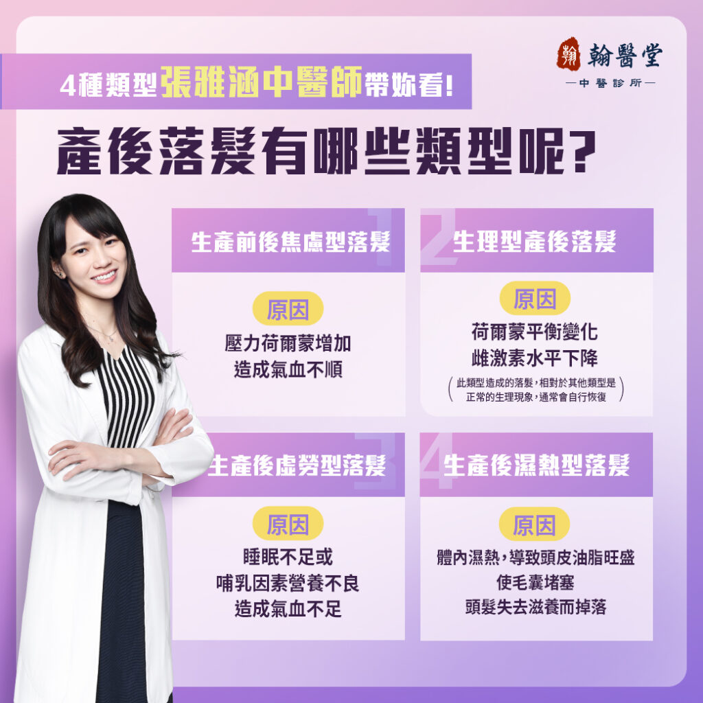 張雅涵中醫師指出,產後落髮並非只有一種原因,中醫臨床常見可分為四種類型: