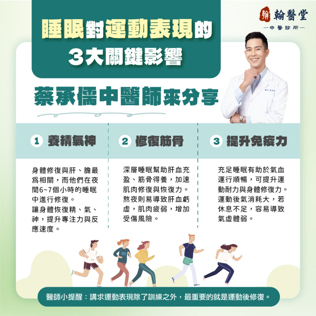 蔡承儒中醫師分享,運動表現的提升除了訓練之外,最重要的就是運動後修復。睡眠對身體有三大關鍵影響: