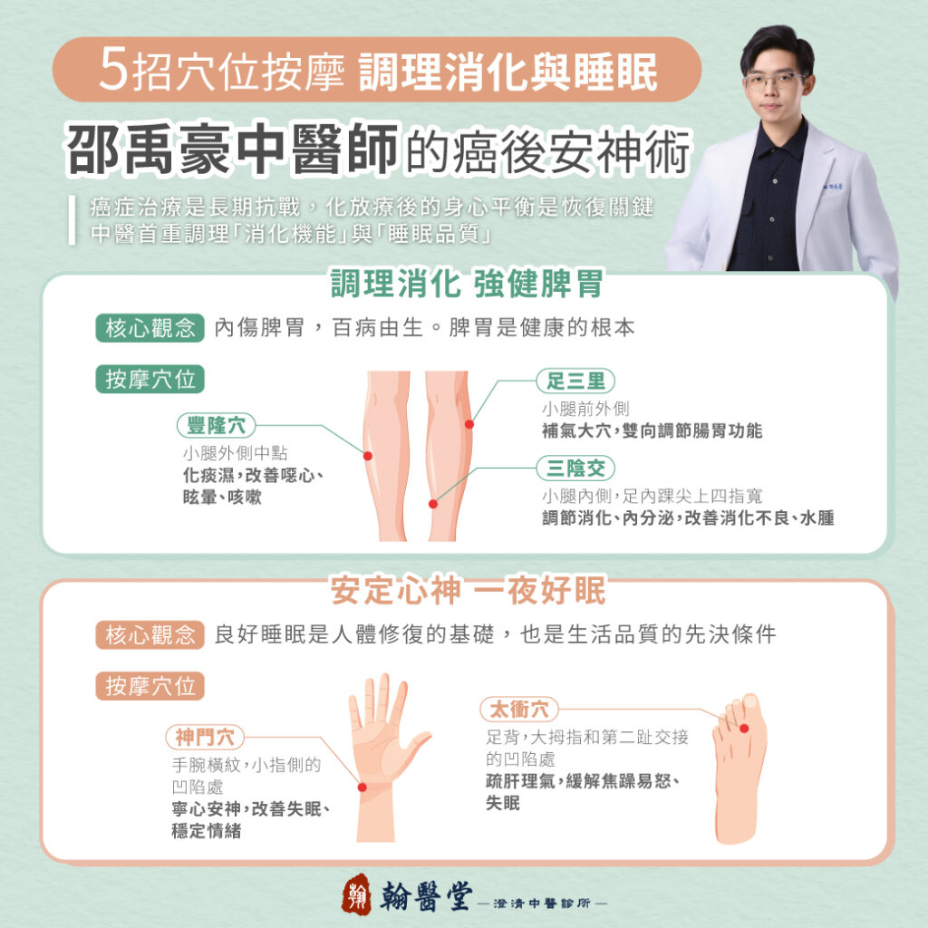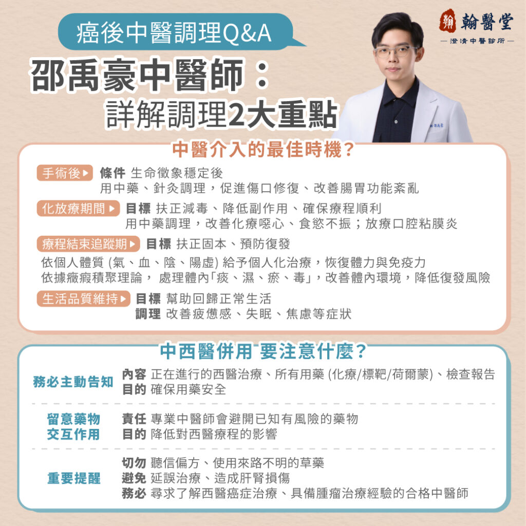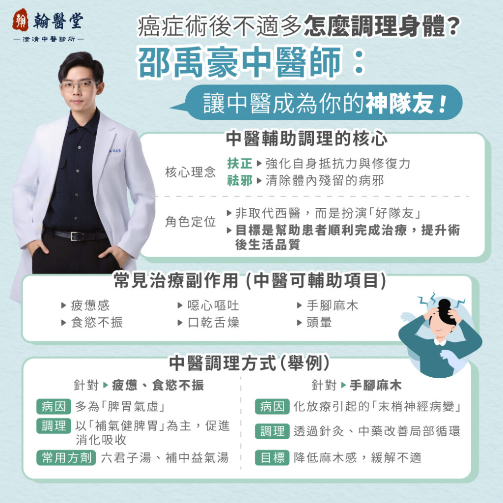 翰醫堂澄清中醫診所邵禹豪中醫師指出,中醫在癌症術後恢復期可作為輔助調理工具,通過辨證施治、針灸與穴位保健,協助患者提升生活品質,促進機體功能恢復,並減輕治療相關副作用。中醫的目標不是替代西醫,而是能夠幫助調理、緩解不適。