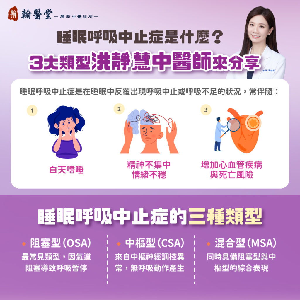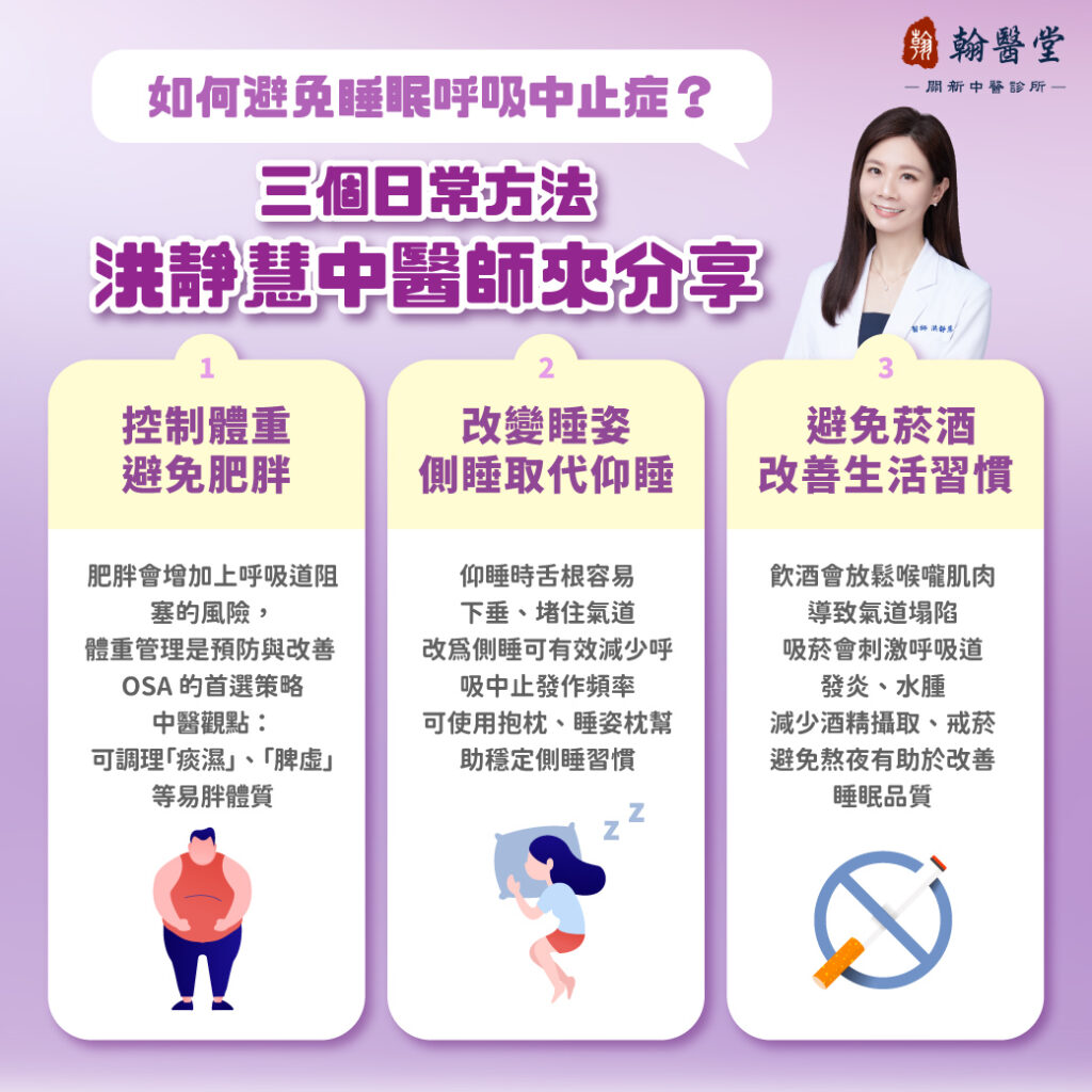 洪靜慧中醫師提醒,如果你或家人經常出現大聲打鼾、睡眠中呼吸中斷、白天嗜睡等情況,務必要及早就醫檢查。透過中醫體質調理、針灸穴位的輔助,加上體重控制與生活習慣改善,能幫助呼吸更順暢,讓睡眠品質真正回到安穩舒適。